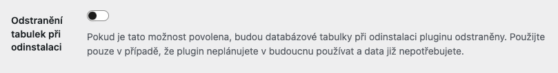 - Povolené odstranění tabulek: Pokud tuto možnost povolíte, databázové tabulky vytvořené pluginem budou při jeho odinstalaci zcela odstraněny. Používejte toto nastavení pouze tehdy, pokud jste si jisti, že data už nebudete potřebovat ani v budoucnu.