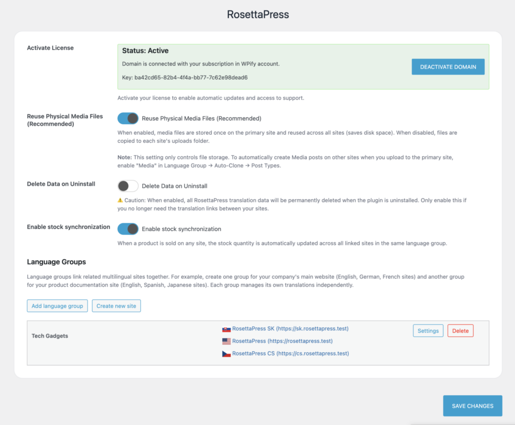 RosettaPress tohle celé automatizuje. Vytvoříte obsah na jednom webu, plugin ho naklonuje na jazykové verze, přeloží co má přeložit, a synchronizuje co má zůstat stejné. Vy vidíte jeden admin panel, ale pod kapotou běží čisté, oddělené databáze. Nemusíte přemýšlet o tom, že máte multisite — plugin tu složitost schová.