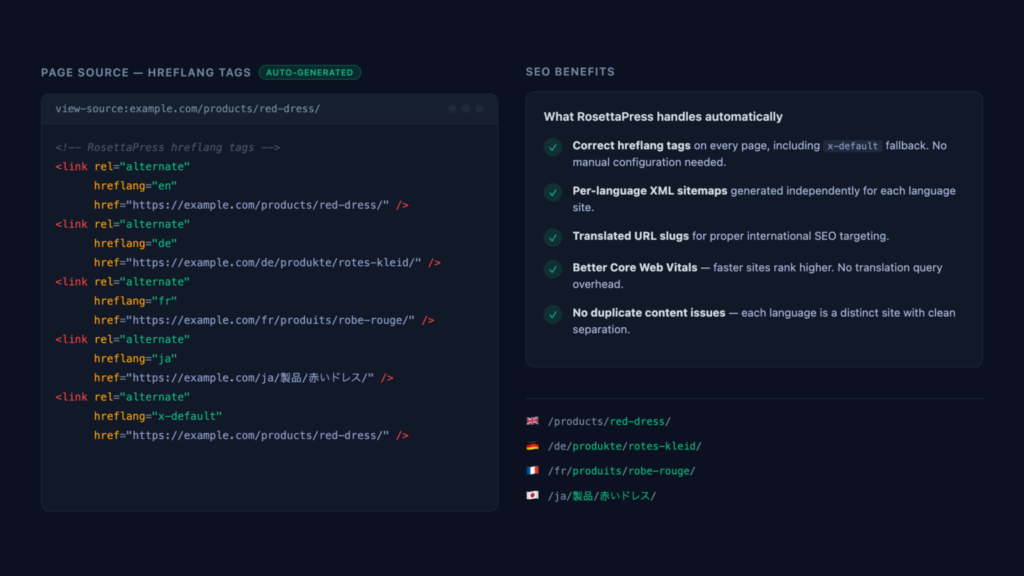 Tohle není žádná raketová věda, ale je překvapivé, kolik vícejazyčných webů má SEO rozbité. Díky multisite architektuře je u RosettaPressu spousta věcí správně už od začátku — protože každý jazyk je plnohodnotný WordPress web s vlastními URL, vlastní sitemapou a vlastním nastavením.